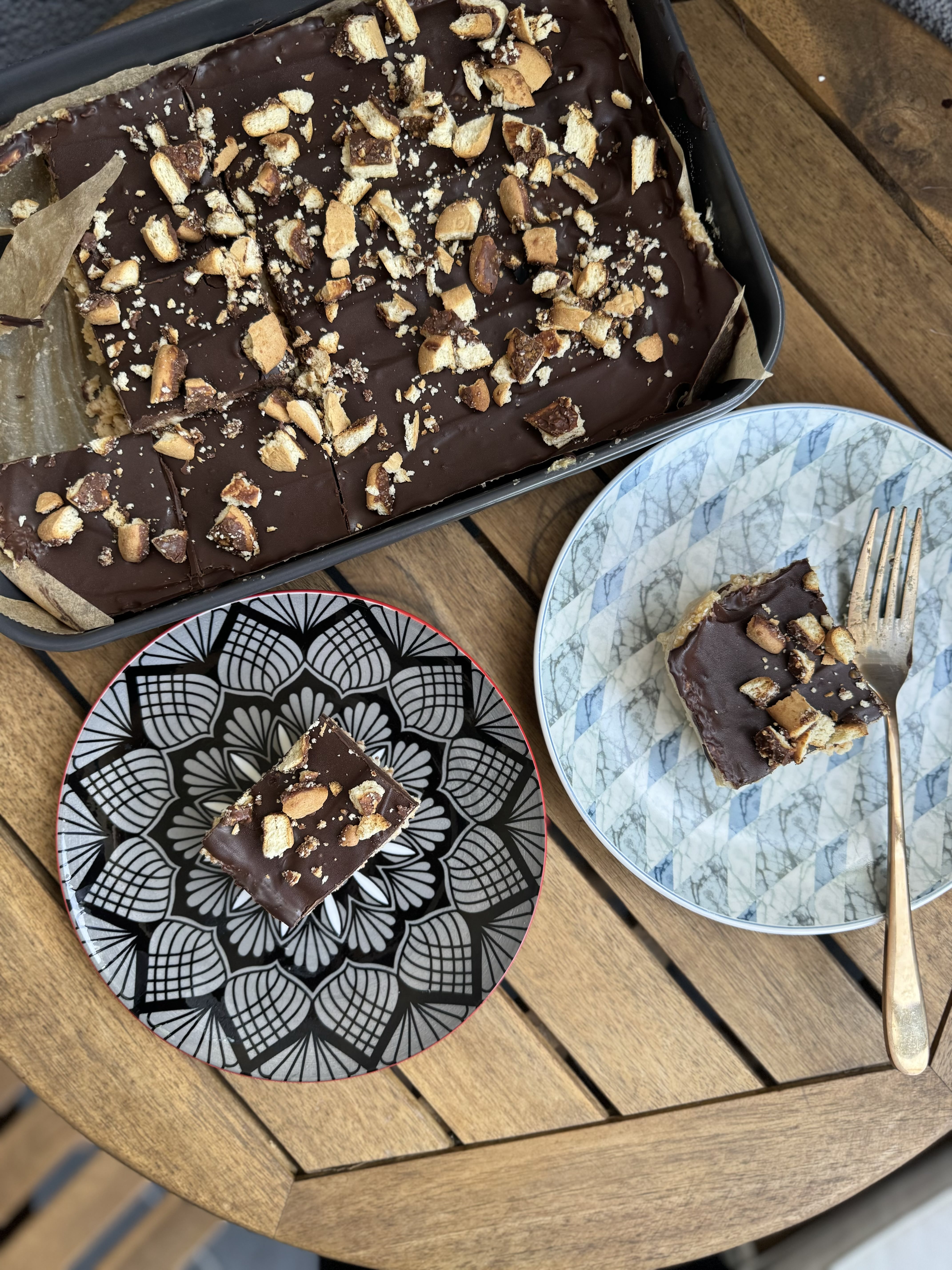 5. Prelijte po kolaču i izravnajte te ukrasite po želji. Mi smo dodali nasjeckane plazma karamela kekse.